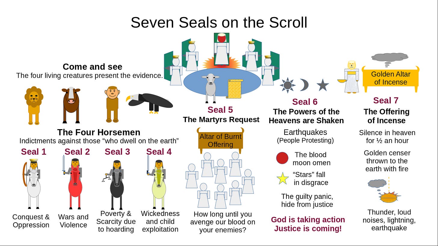 The thrones have been set, the court sits in judgment, it is time for the books to be opened as the Lamb, the Lion of Judah, begins removing the seven seals from the scroll. Witnesses will be called to testify against the beast, the victims will cry out for justice, and the Lord will begin to reveal signs that He is coming to avenge the blood of His faithful servants. This will cause all who dwell on the earth to panic and try to hide from justice. This is the subject of Revelation chapter 6.